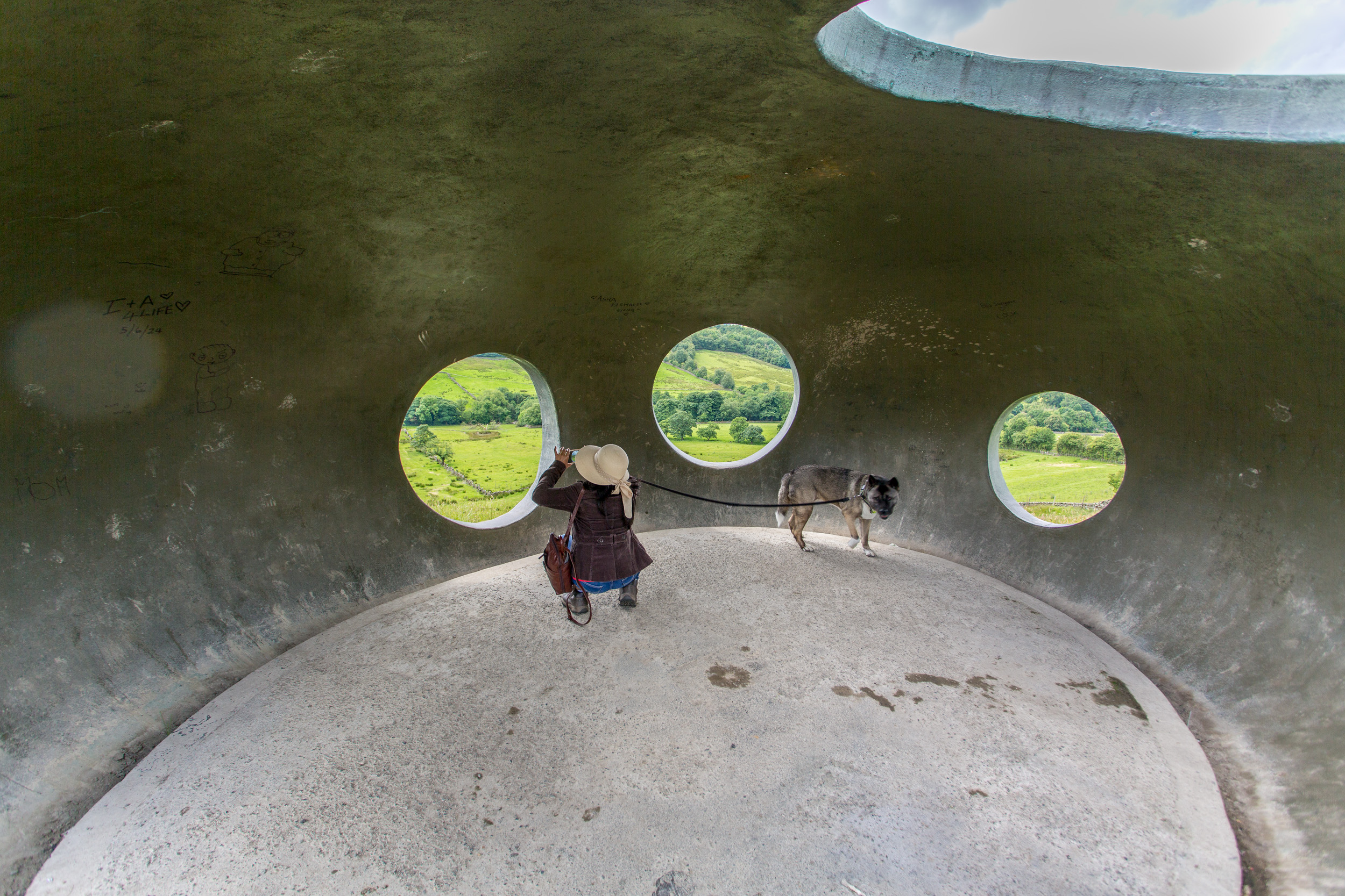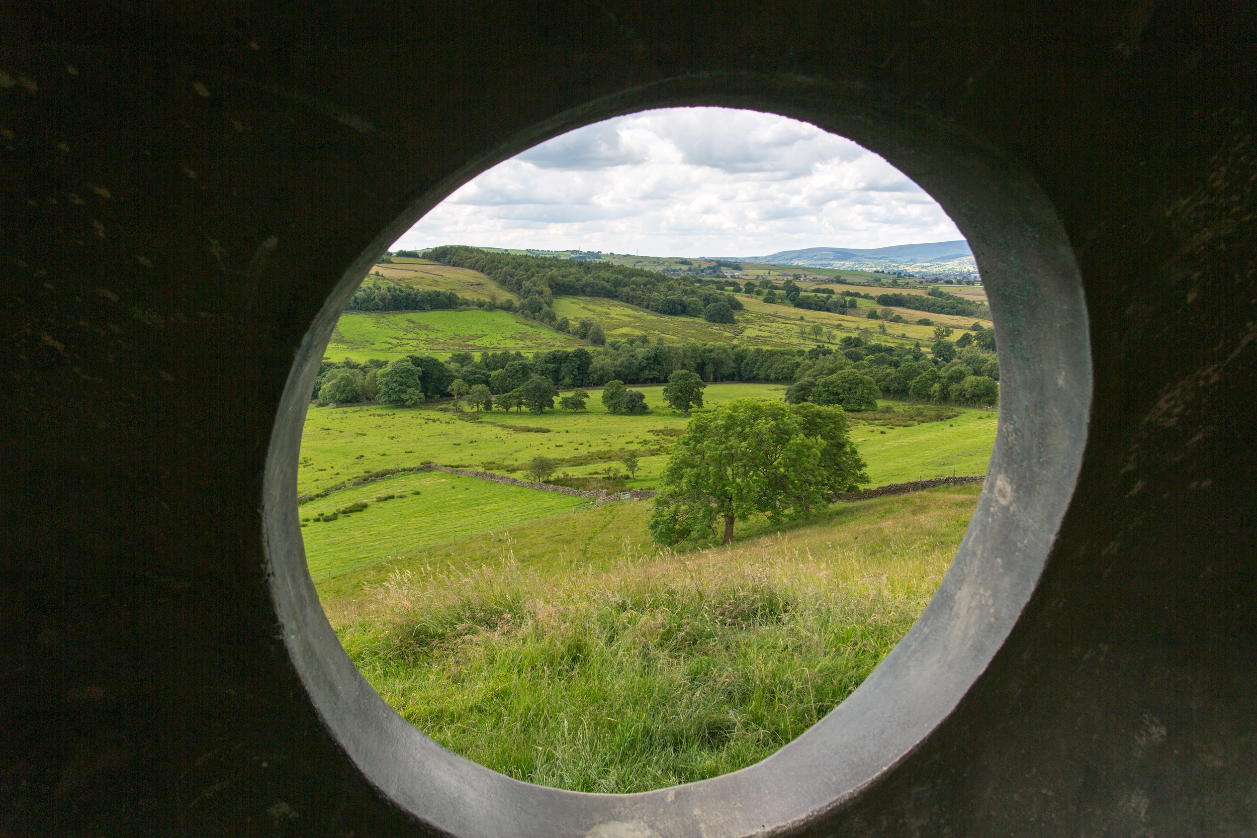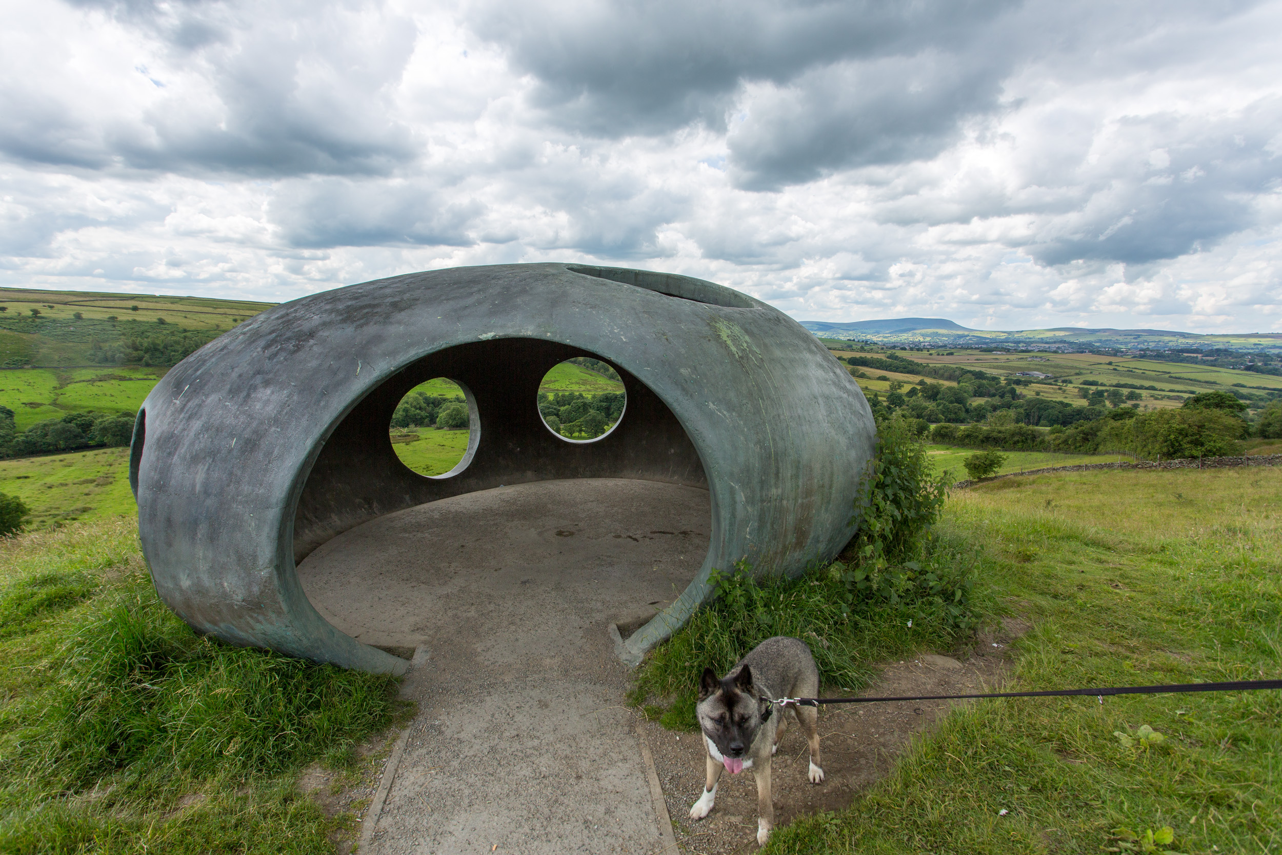 Pendle's Panopticon, 'Atom', rests on the hillside above Wycoller village in Wycoller Country Park. Constructed in ferro-cement with a surface coating of metal-based paint, it is both a striking contemporary viewing point and shelter from which to enjoy Pendle's glorious scenery, and an intriguing and beautiful object which can be viewed from afar. From inside, its circular viewing spaces frame spectacular views of the surrounding countryside. |